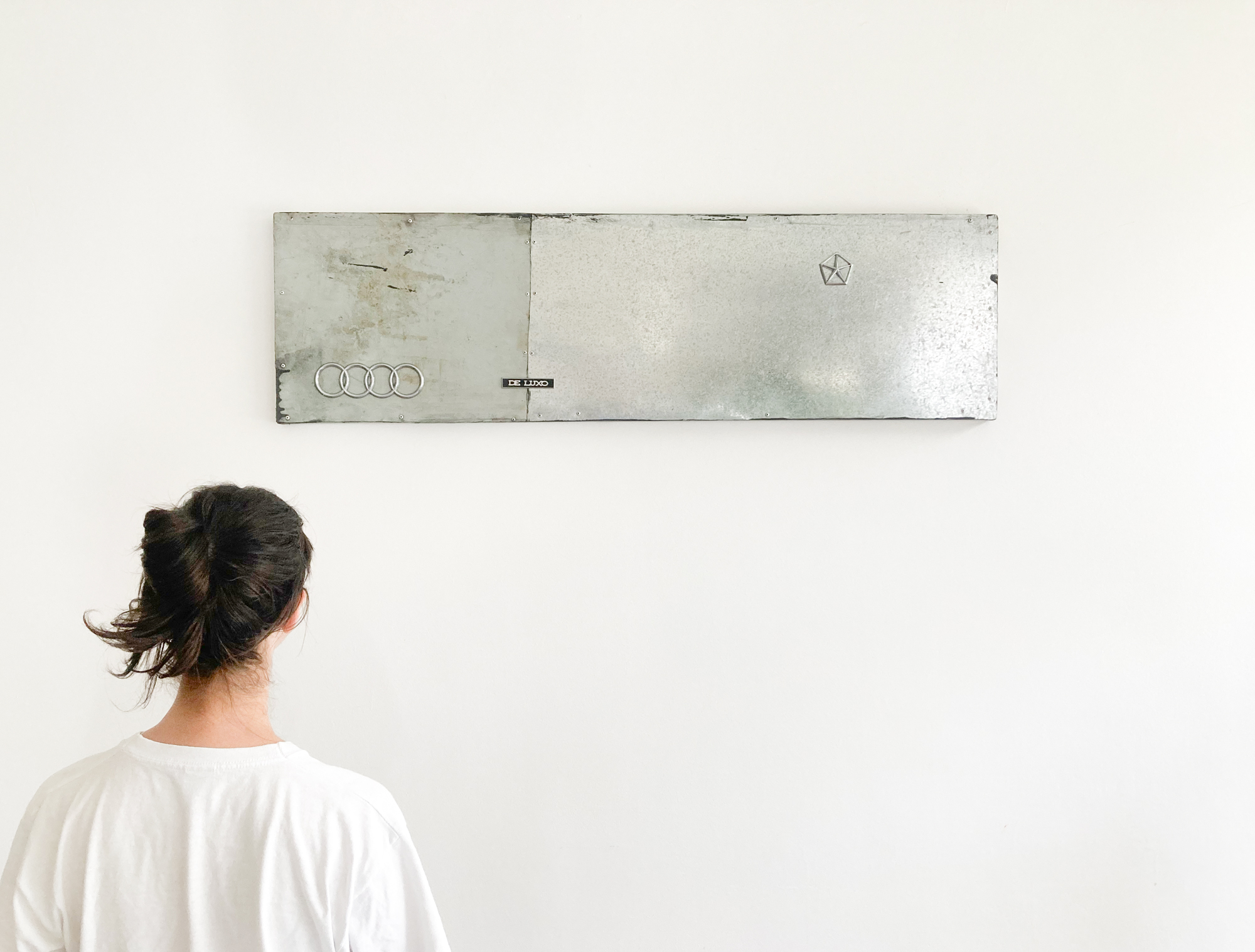 emblemas automotivos usados, chapas de aço galvanizado encontradas e barras de metalon, 34 x 120 cm