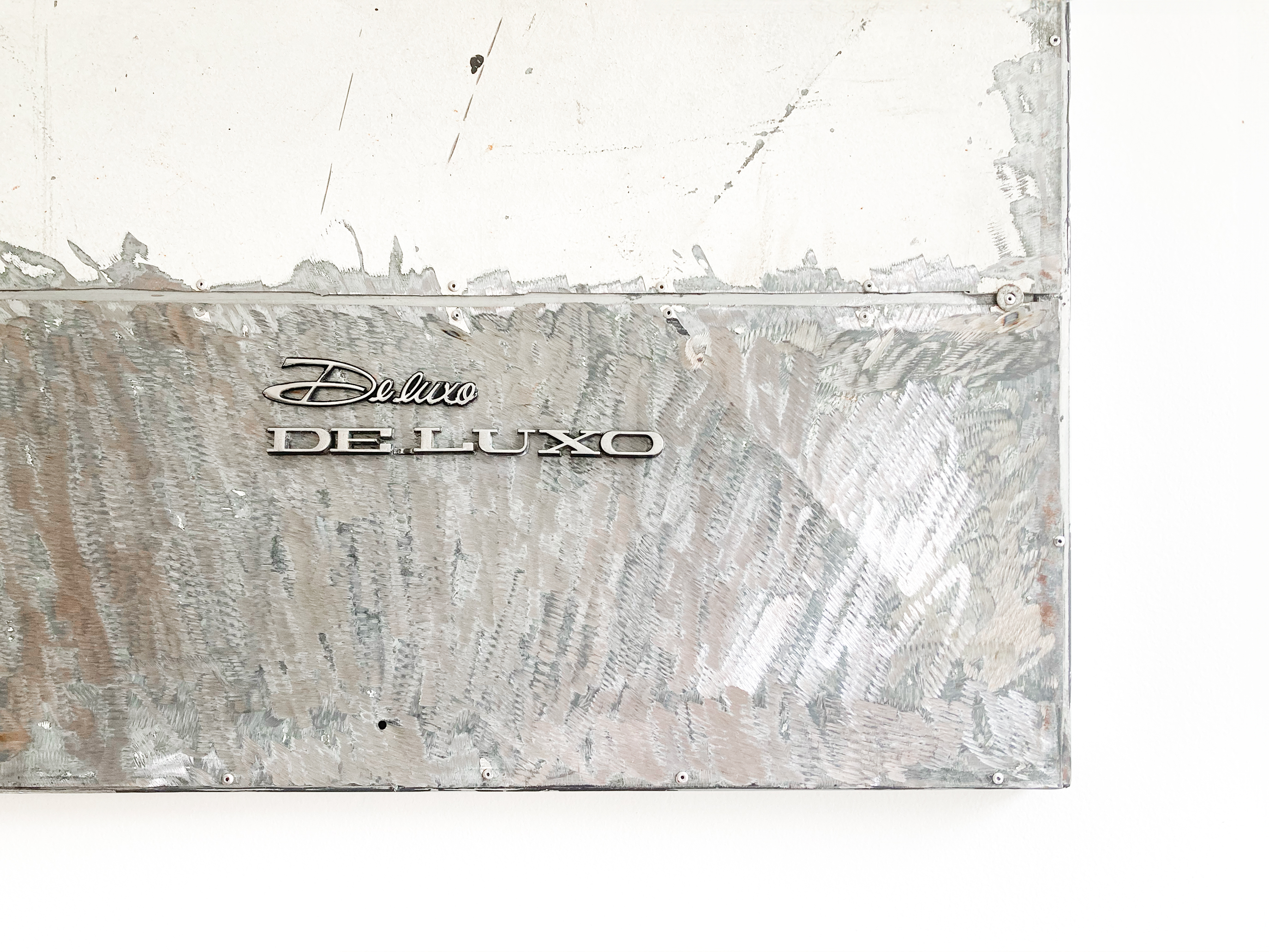 emblemas automotivos usados, chapas de aço galvanizado encontradas e barras de metalon, 55 x 85 cm
